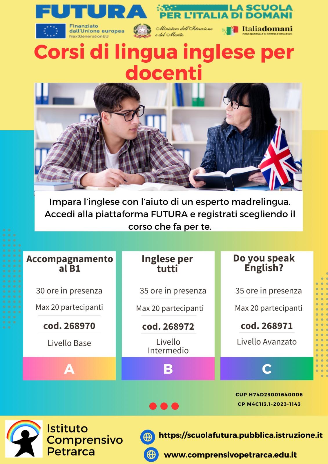 Con il nuovo anno scolastico, invece, sono iniziati i corsi di inglese dedicati ai docenti. Saranno disponibili 3 corsi di formazione relativi a tre diversi livelli linguistici.